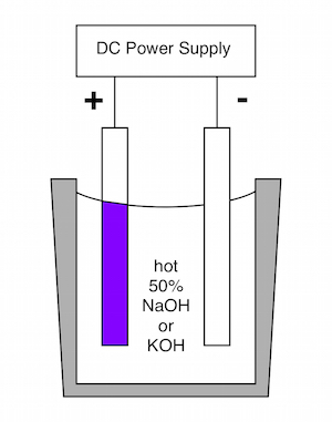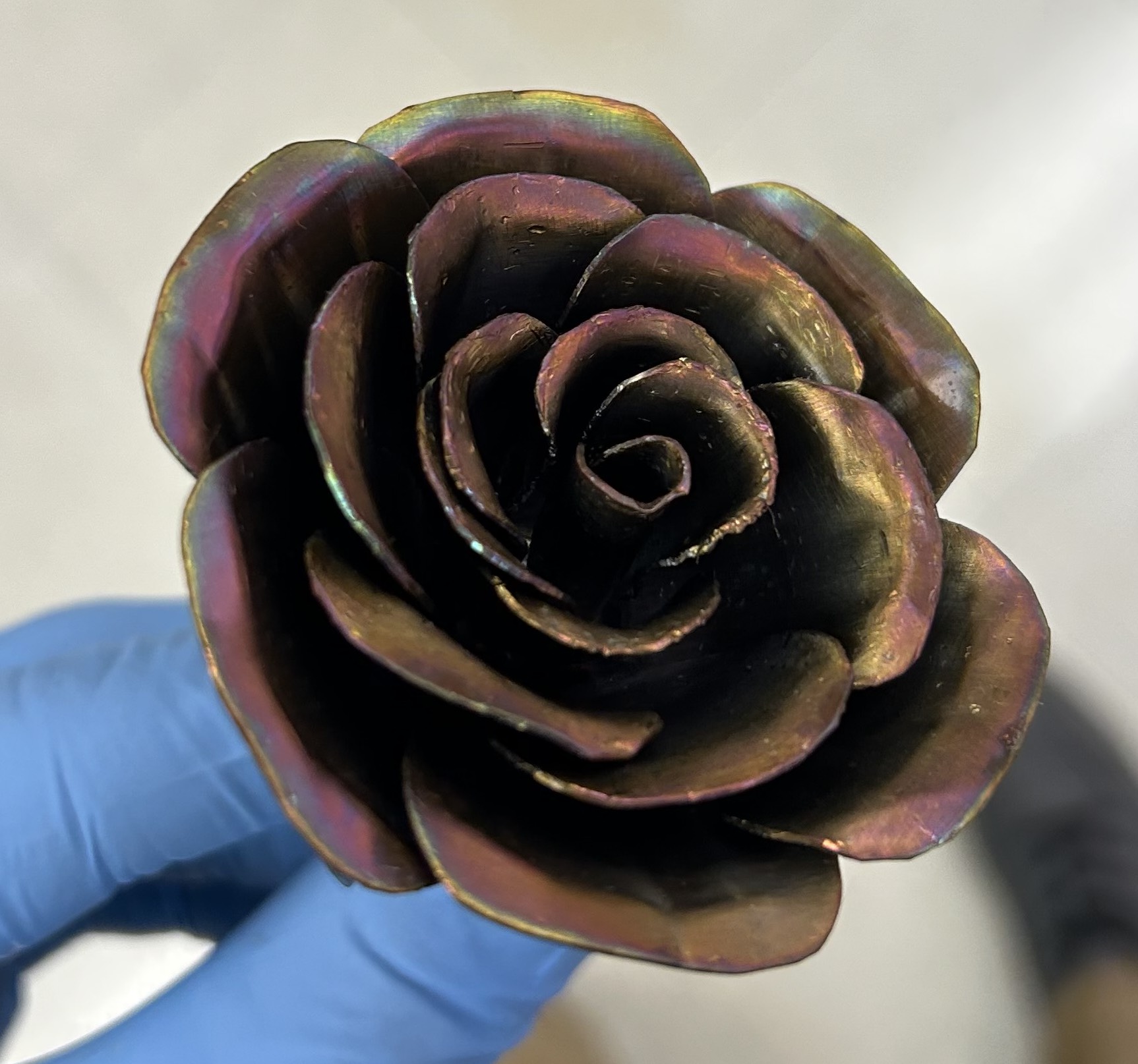 A steel rose was anodized by Brooks Robinson while a senior at RL Turner High School, Carrollton, TX, in 2023. The steel rose was cold-rolled mild steel, TIG welded together, bent with pliers, and polished before anodizing in 12.5 M NaOH at +2.5 volts. |