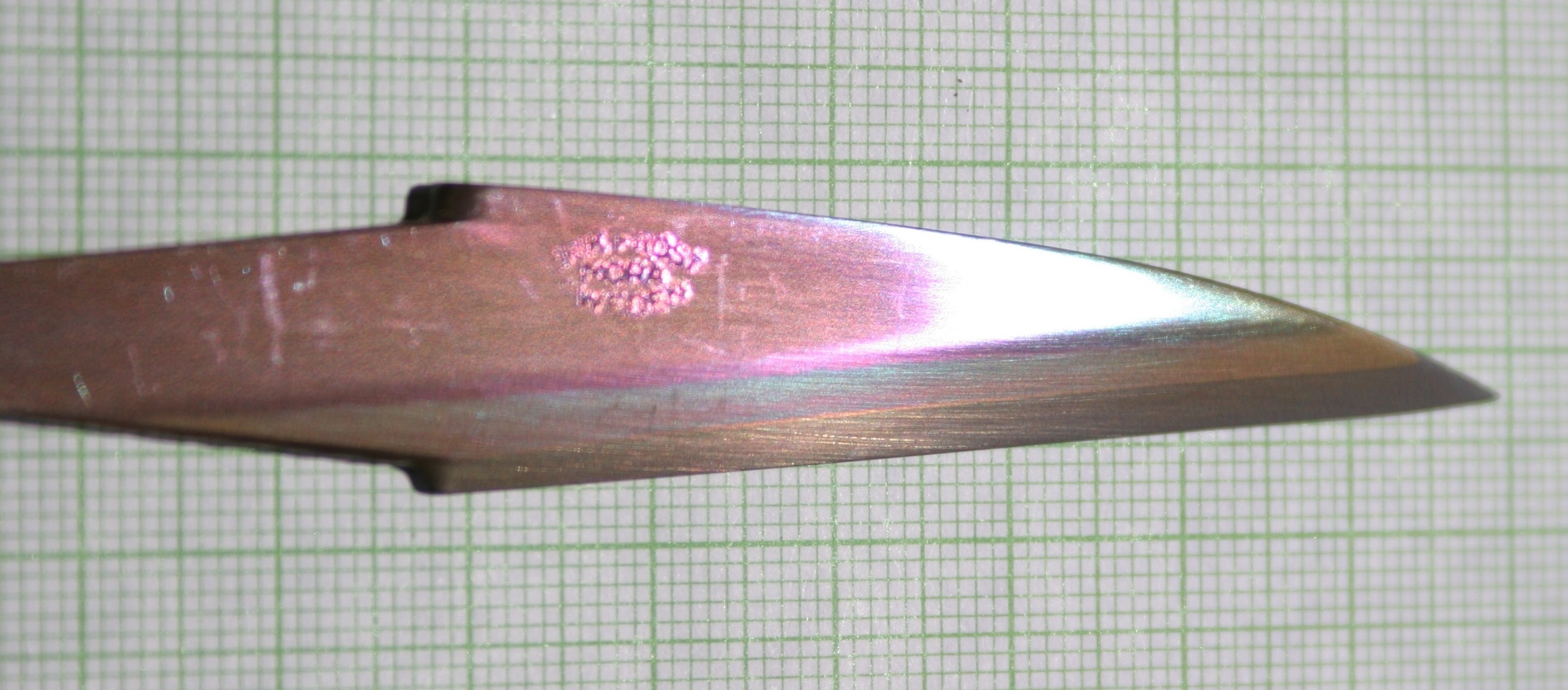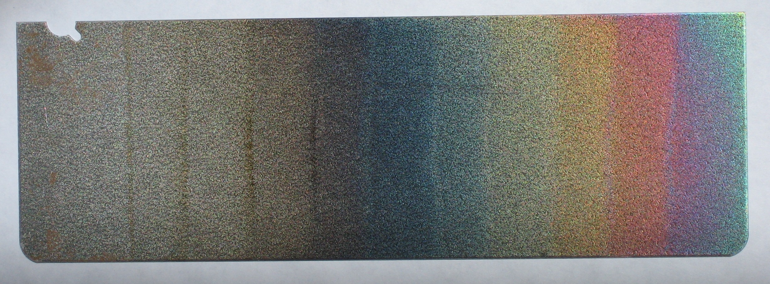 A dichroic knife blade made from layered carbon steel has been steelanodized. The steel layers have different compositions, which grow different oxide thicknesses, and therefore reflect different colors, giving the steel the rainbow appearance. |