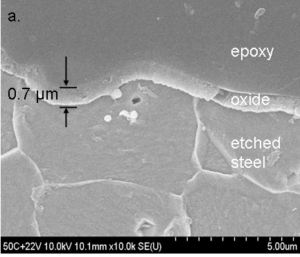 SEM cross-section of the anodic film grown on steel at 50 C and +2.2 V. (Fig 3a in Burleigh et al [3]). |