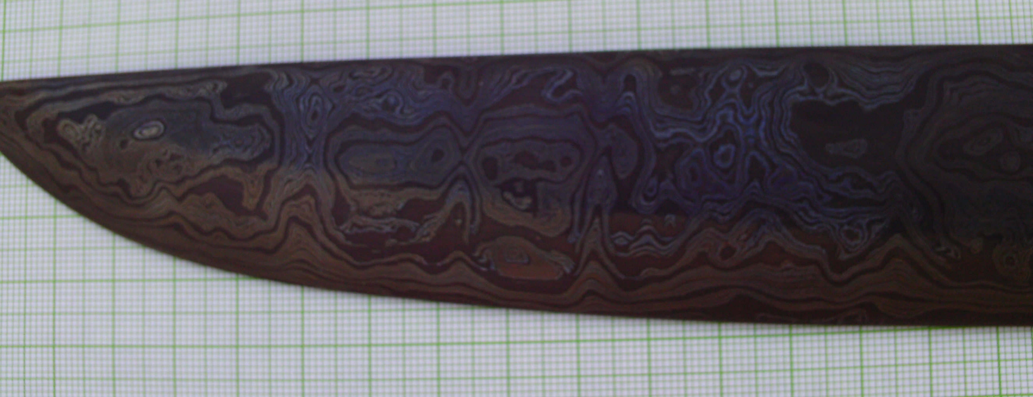 A Damascus steel knife blade has been etched and then steelanodized. The different compositions of steel and the different heat treatments reflect different colors. |