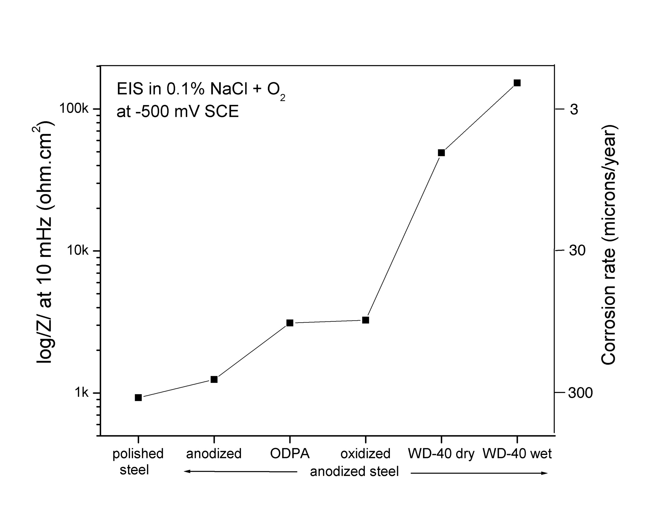 The steelanodizing provides corrosion protection against aerated saltwater if the pores are sealed with WD-40. The graph shows the reduction in the corrosion rate of steel with the different surface treatments. (Fig 18 in Burleigh et al [3]). |