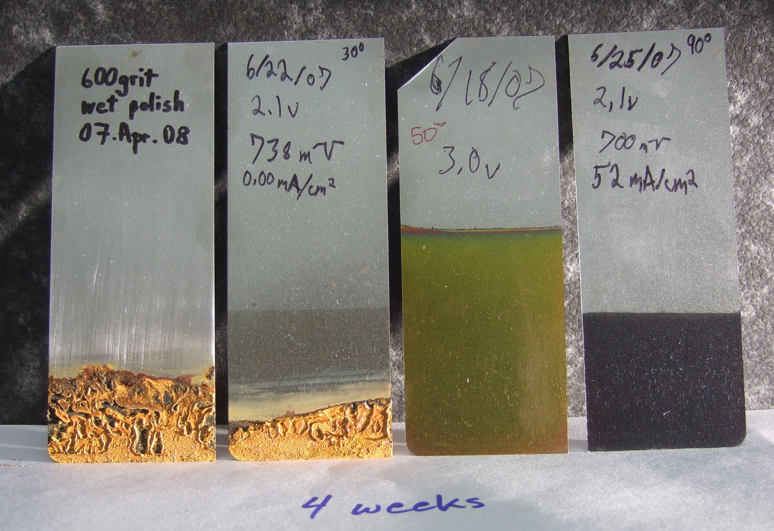 The steelanodizing provides corrosion protection against pure water. The four steel panels are shown after four weeks of partial immersion in 100 mL 18 MegaOhm-cm water after the water had evaporated. The far left panel was wet polished to 600 grit SiC prior to testing. The middle left panel was partially steelanodized. The two right panels were fully steelanodized at 50 C and +3.0 V, and at 70 C and +2.1 V respectively. (related to Fig 17 in Burleigh et al [3]). |