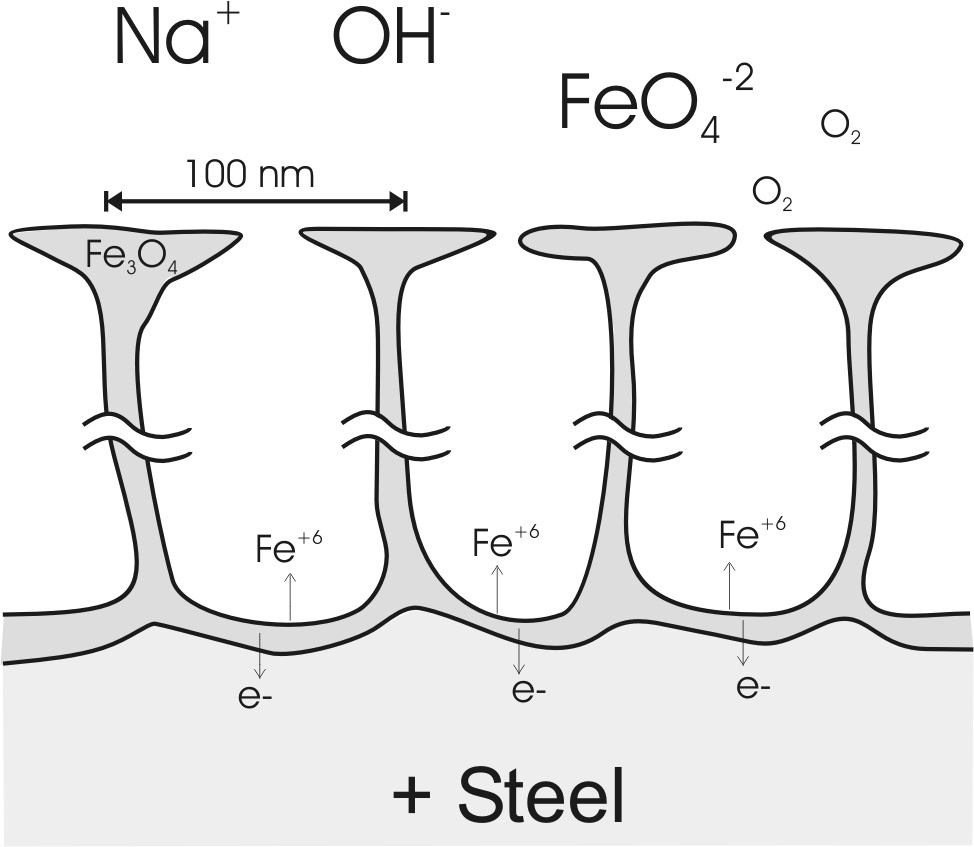 A model of the nano-porous magnetite (Fe3O4) channels which compose the anodic oxide. (Fig 10 in Burleigh et al [3]). |